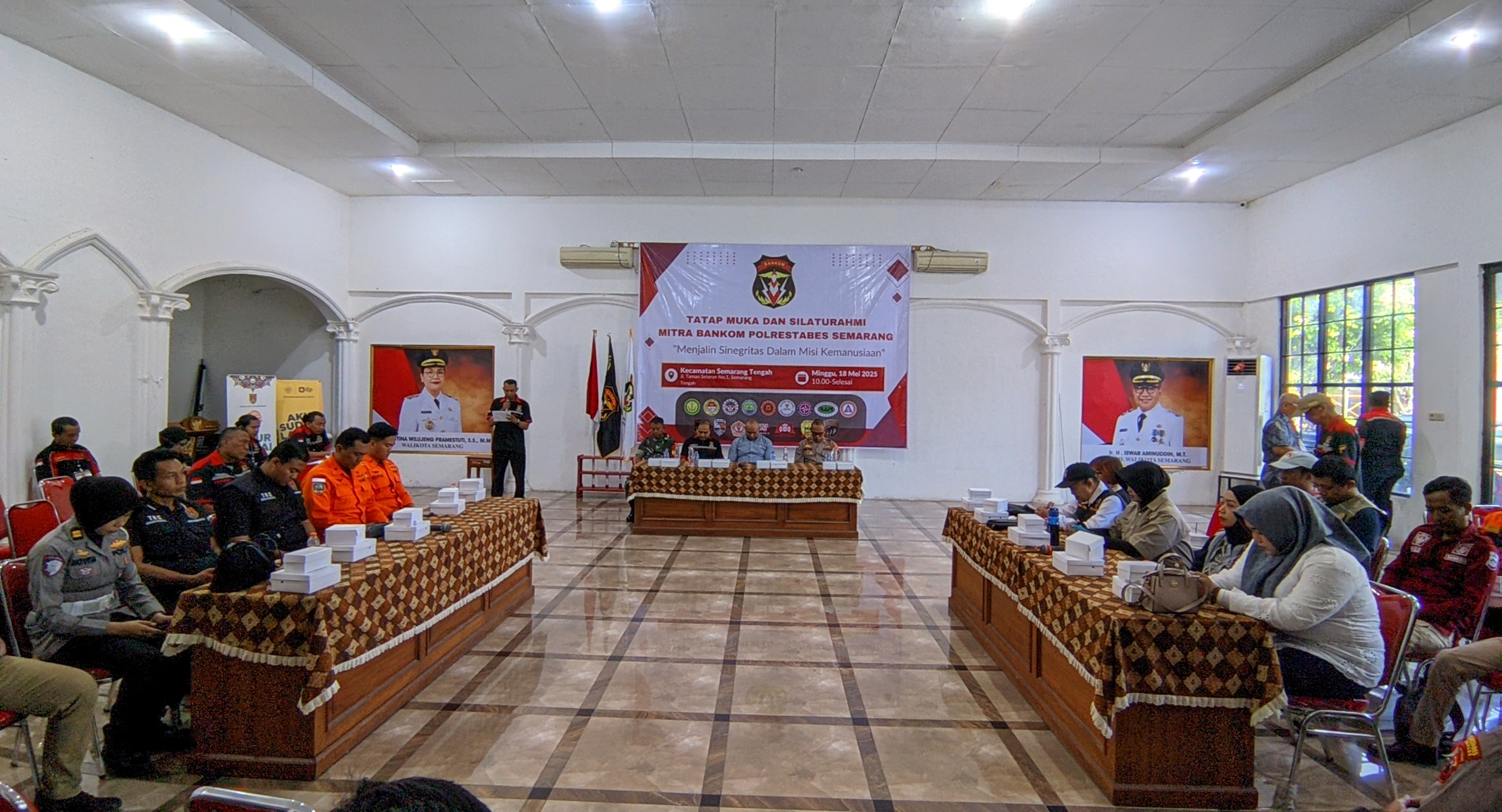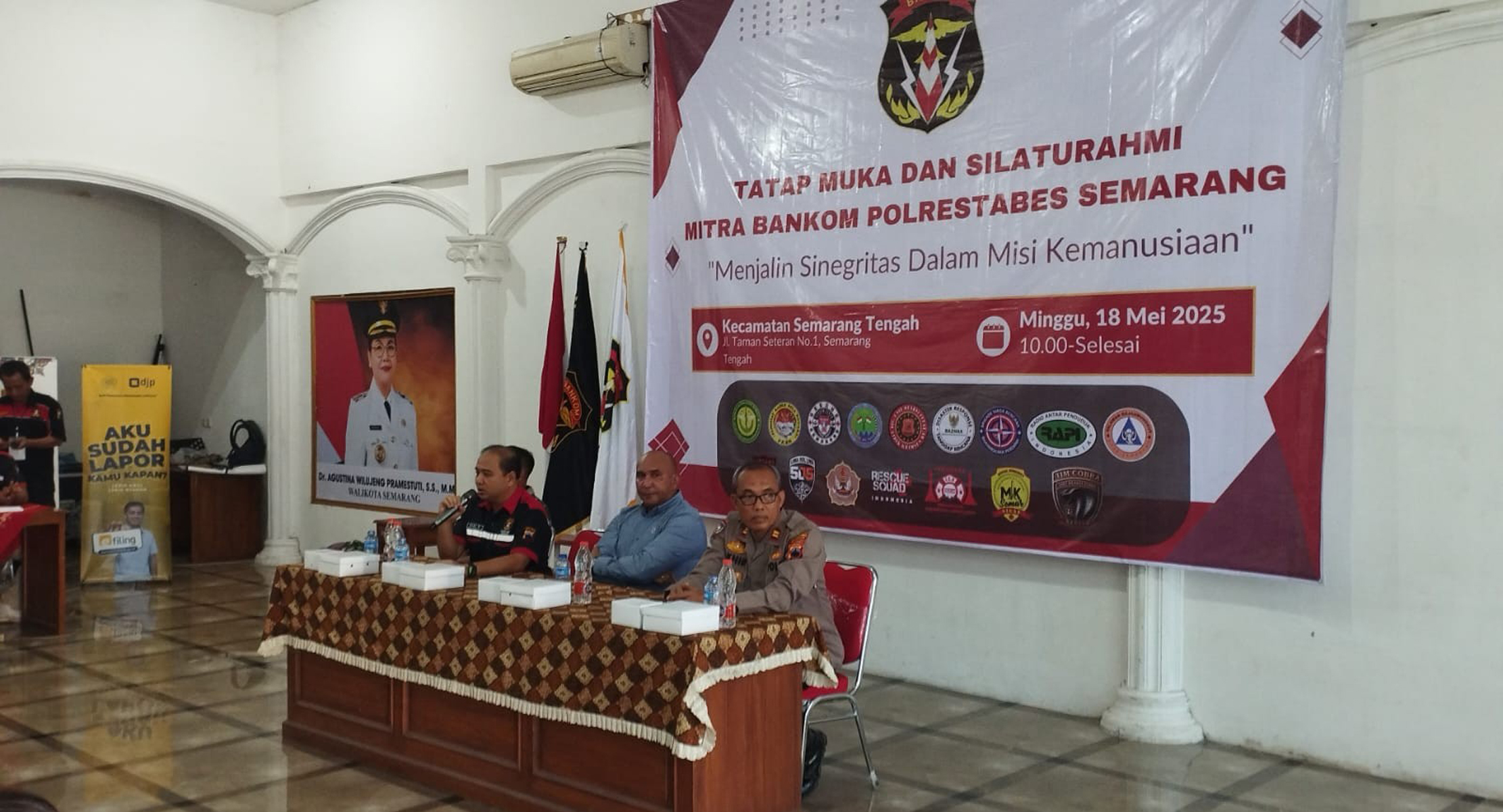 KOTA SEMARANG, BANKOM SEMARANG NEWS.ID – Dalam rangka memperkuat koordinasi dan kerja sama lintas organisasi dan lintas instansi dalam misi kemanusiaan, digelar kegiatan Tatap Muka dan Silaturahmi Mitra Bankom Polrestabes Semarang. Acara yang bertema “Menjalin Sinegritas Dalam Misi Kemanusiaan” ini bertempat di Aula Kecamatan Semarang Tengah, Jalan Taman Seteran Semarang pada Minggu (18/05/2025) pukul 10.00 WIB hingga selesai.