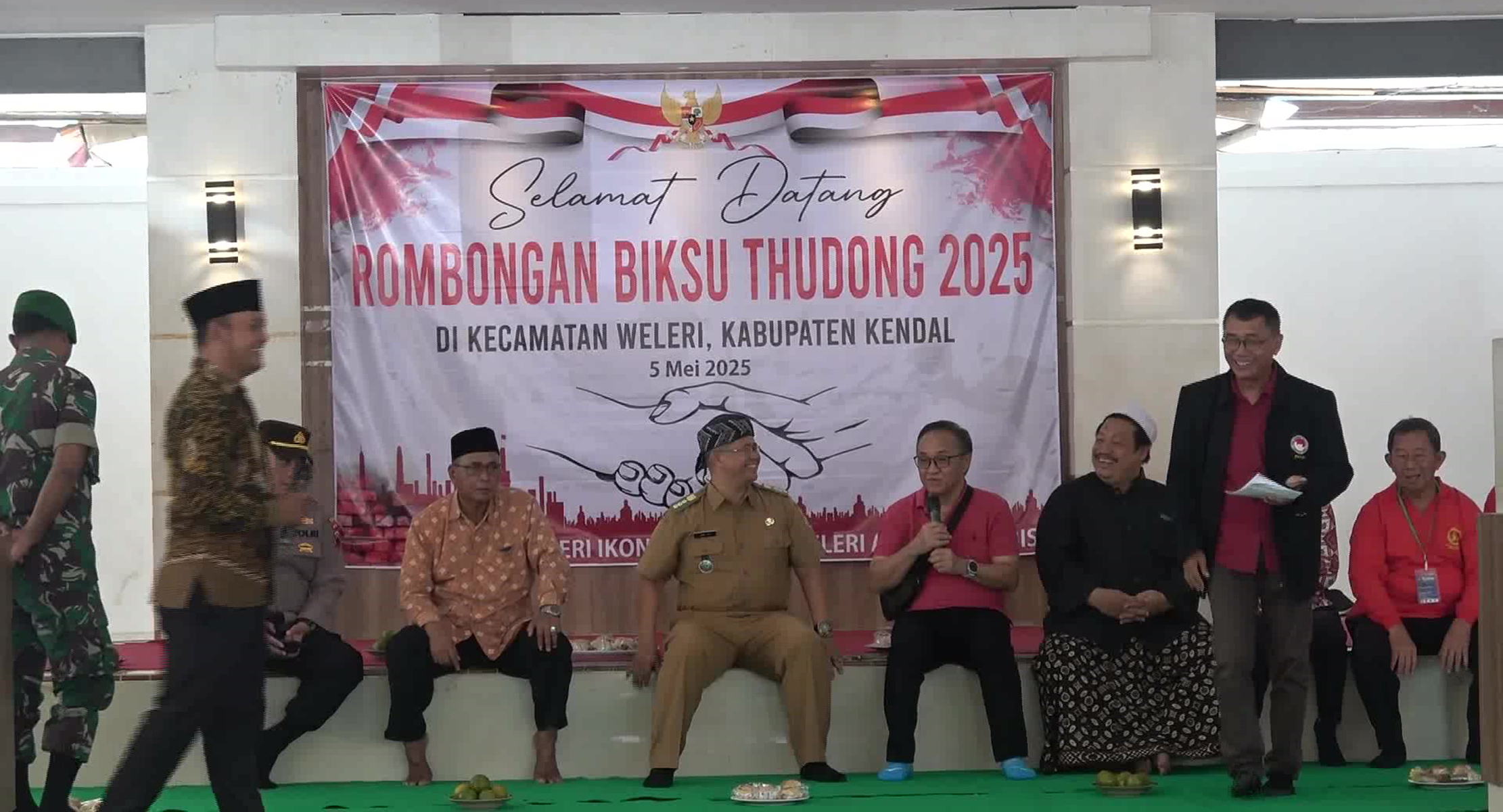 Camat Weleri, Bapak Dwi Cahyono Suryo, menyambut kedatangan para biksu Thudong dengan hangat dan penuh semangat kebersamaan. Dalam acara penyambutan yang berlangsung di Pendopo Kecamatan Weleri, beliau menyampaikan ucapan selamat datang kepada rombongan biksu yang melakukan perjalanan spiritual dari Bangkok menuju Candi Borobudur. Sebagai bentuk apresiasi dan dukungan, Camat Dwi Cahyono juga memberikan beberapa bingkisan kepada para biksu.