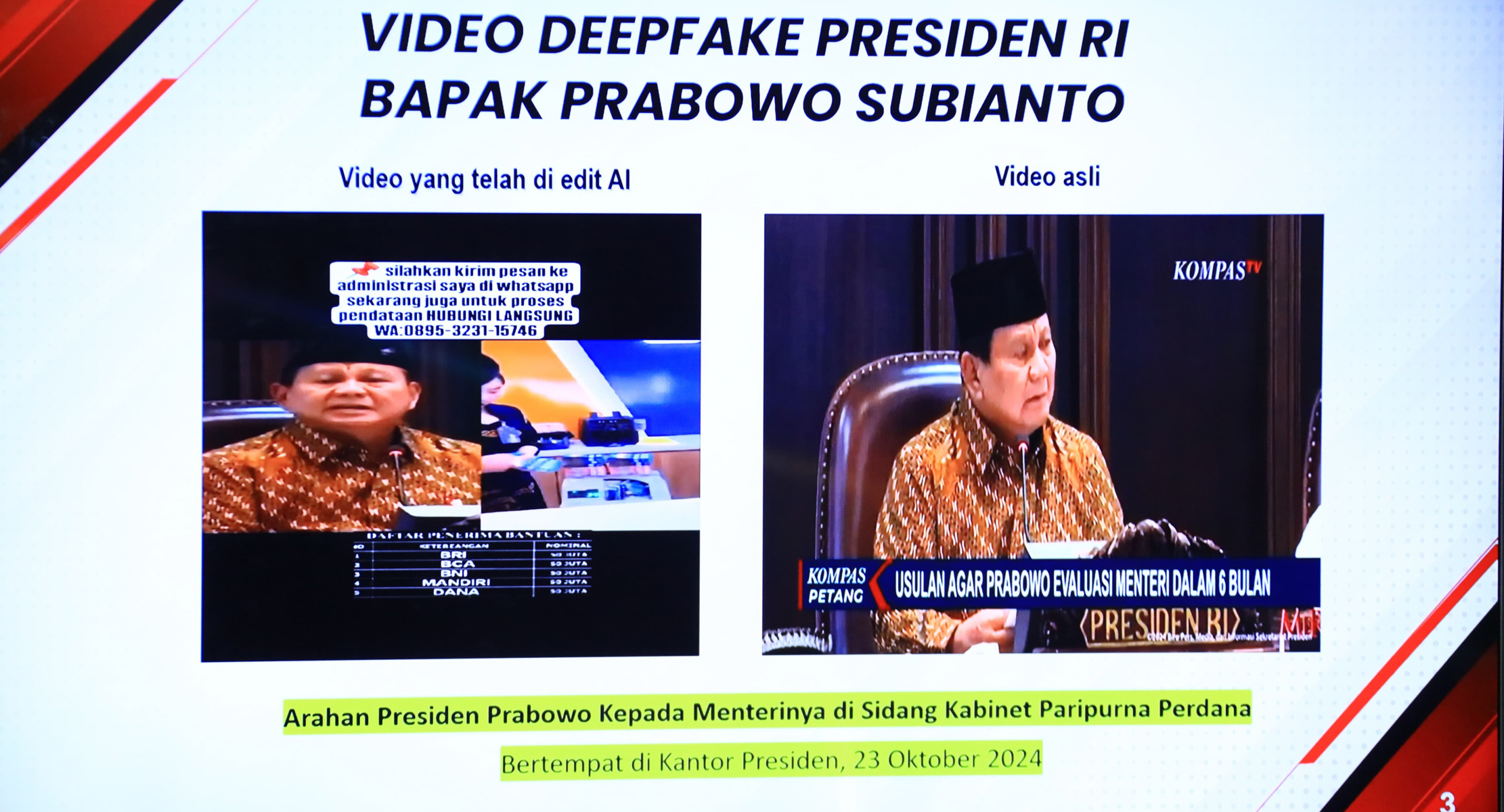 Dirtinpidsiber Bareskrim Polri Brigjen. Pol. Himawan Bayu Aji mengungkap, tersangka AMA menggunakan Artificial Intilligence (AI) Presiden Prabowo Subianto, Wakil Presiden Gibran Rakabuming Raka, dan Menteri Keuangan Sri Mulyani. Video itu kemudian disebar tersangka ke media sosial untuk menjaring para korban.