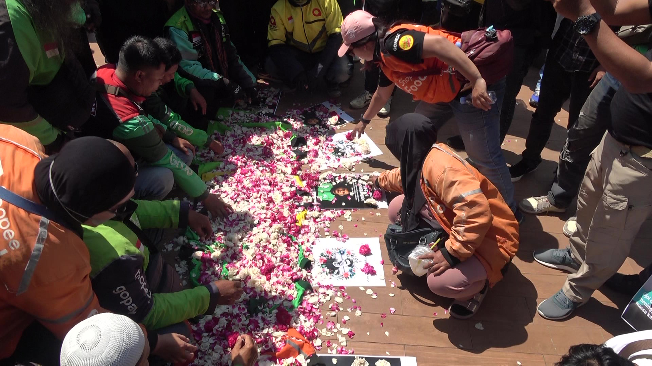 Acara doa dipimpin oleh Nuryatim, seorang pengemudi Shopee, dilanjutkan tabur bunga di atas jaket ojol sebagai simbol kehadiran spiritual mereka di peristirahatan terakhir almarhum Affan. Seluruh peserta juga melantunkan shalawat bersama.