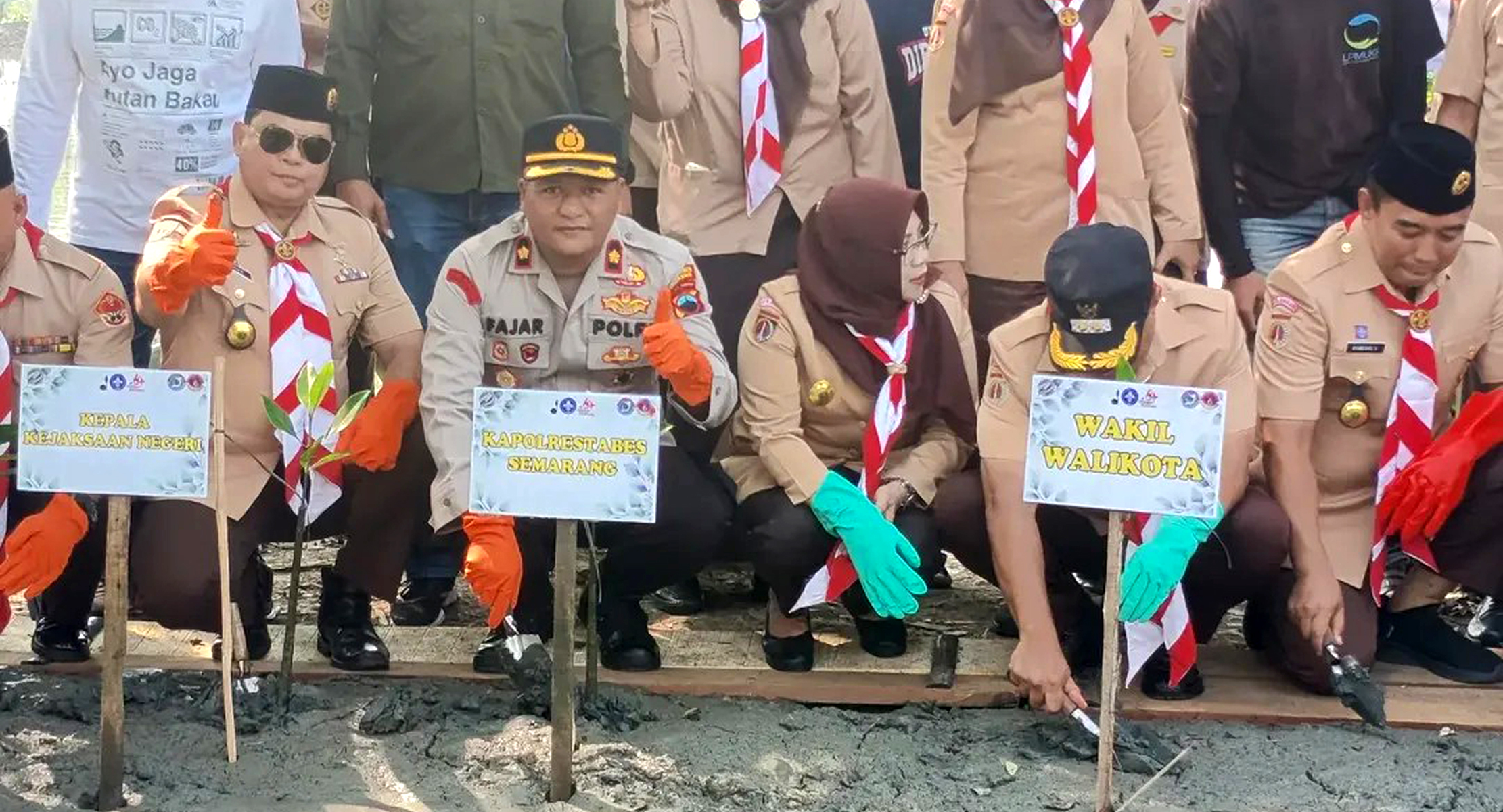 Penanaman mangrove dipimpin langsung Wali Kota Semarang, Dr. Agustina Wilujeng Pramestuti, S.S., M.M., didampingi Wakil Wali Kota Semarang Ir. H. Iswar Aminuddin, M.T., Ketua DPRD Kota Semarang, Kepala Kejaksaan Negeri Kota Semarang, Ketua Pengadilan Negeri Kota Semarang, Ketua Kwarcab Kota Semarang Dr. Bambang Pramusinto, S.H., S.I.P., M.Si., Ketua Mabiran Tugu Eko Agus Padang Haryanto, S.STP., M.M., serta Kapolrestabes Semarang yang diwakili Kapolsek Tugu, KOMPOL Fajar Widiyanto, S.H., M.Si. Turut hadir anggota Polsek Tugu, Bhabinsa Tugurejo, anggota Pramuka, dan masyarakat setempat.