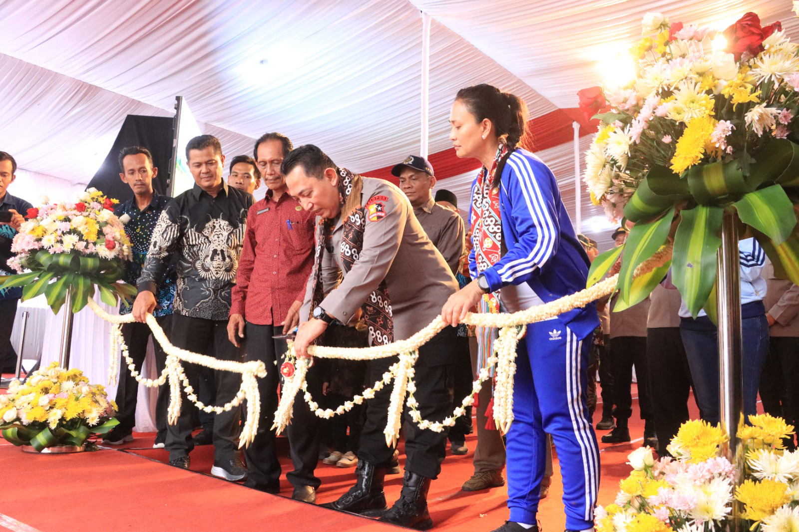 Setelah penyerahan bantuan sosial, Kapolri bersama Ibu Ketua Umum Bhayangkari, didampingi Kapolda DIY dan Ketua Bhayangkari Daerah DIY, melakukan penandatanganan prasasti dan pemotongan pita sebagai simbol peresmian jalan dan saluran irigasi.