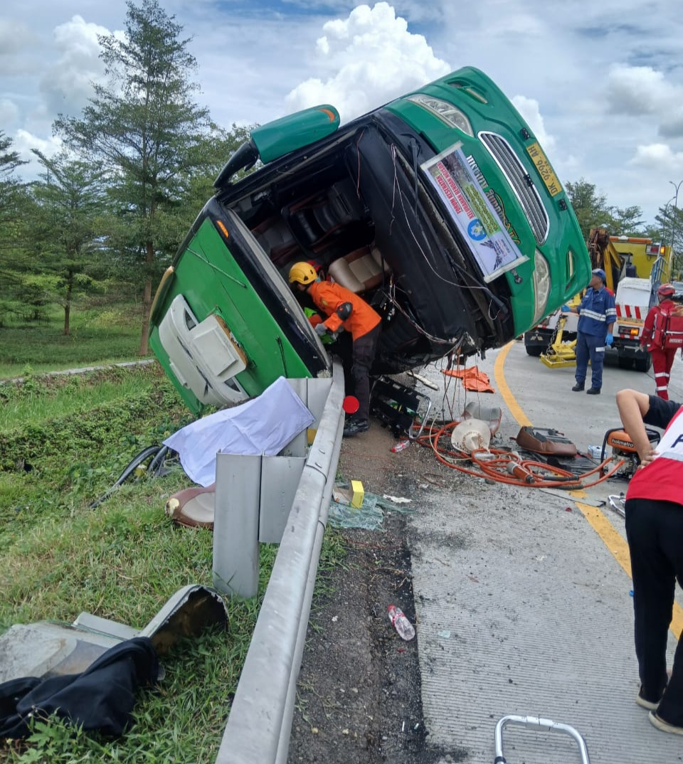 Diduga karena rem blong, bus hilang kendali dan menabrak pembatas jalan saat berada di tikungan arah Exit Tol Pemalang. Akibatnya, kendaraan terguling dan beberapa penumpang terhimpit oleh bodi bus.