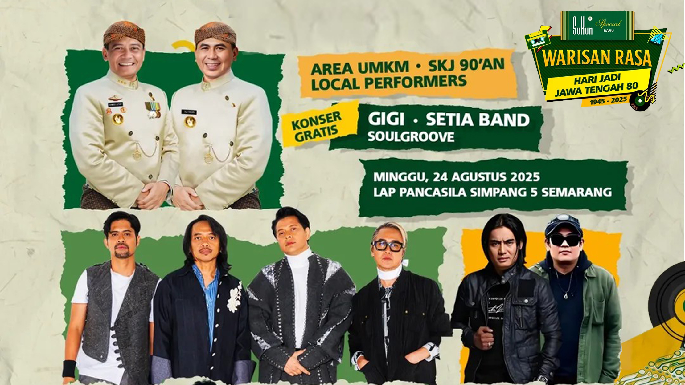 Selain hiburan musik, puluhan stan kuliner dan UMKM lokal juga meramaikan kawasan Simpang Lima. Acara ini gratis dan terbuka untuk umum dengan sistem registrasi online.