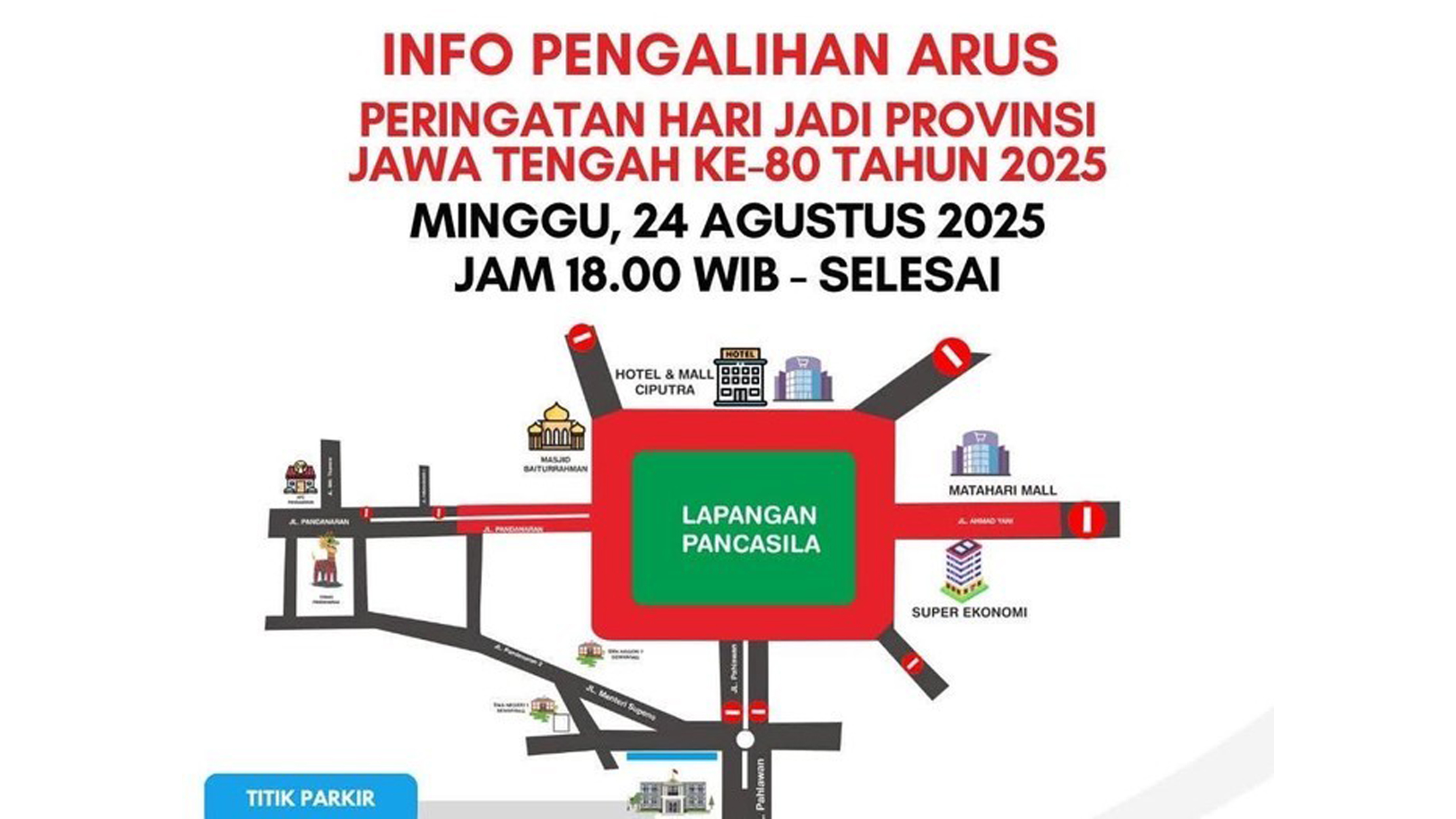 Ia menjelaskan, pengalihan arus akan dimulai sekitar pukul 18.00 WIB. Beberapa ruas jalan diperkirakan terdampak, di antaranya Jalan Pandanaran, Jalan Pahlawan, dan Jalan Ahmad Yani.