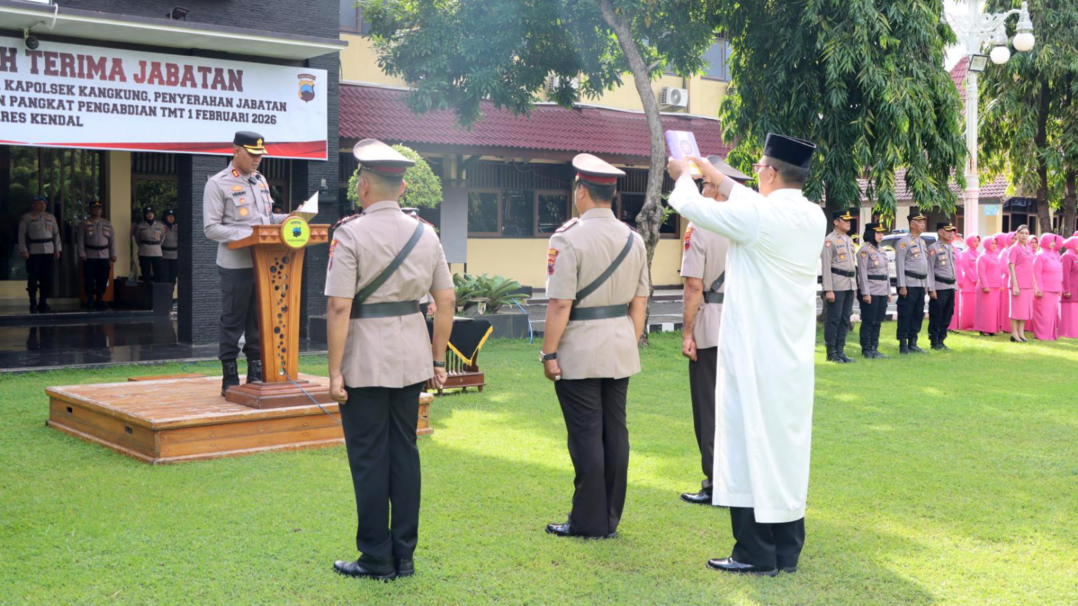 Upacara dipimpin Kapolres Kendal AKBP Hendry Susanto Sianipar, S.I.K. sebagai Inspektur Upacara, didampingi Perwira Upacara AKP Danang Christian, S.H. serta Komandan Upacara IPTU Karyono, S.H. Peserta yang hadir terdiri dari pejabat utama, Kapolsek jajaran, hingga personel dari berbagai satuan fungsi dan PNS Polri, mencerminkan soliditas lintas unit dalam satu komando organisasi.