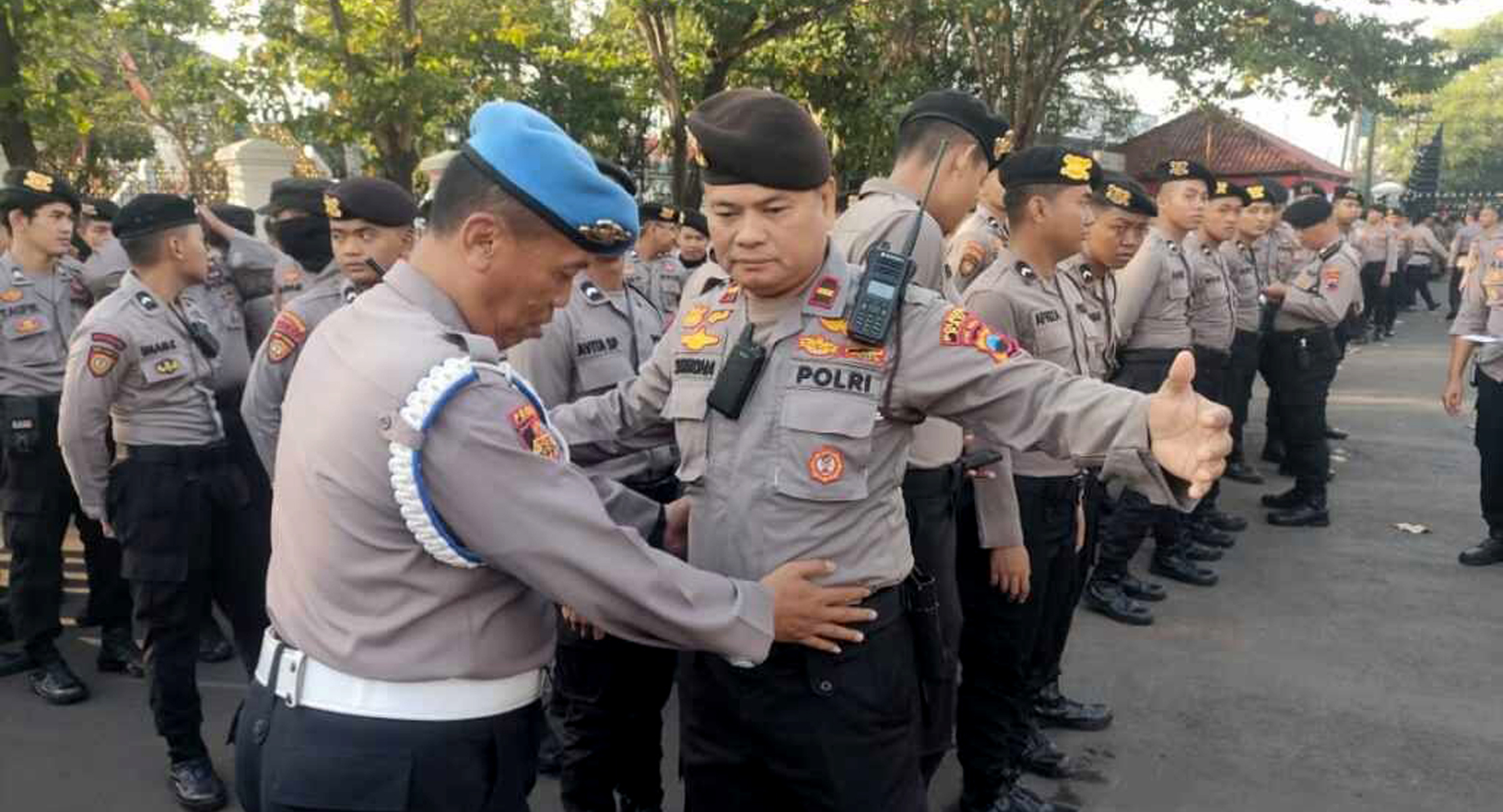 Tim Bidpropam memeriksa kelengkapan dan kesiapan pasukan dari berbagai satuan, memastikan tidak ada anggota yang membawa senjata api maupun pentungan, sebagai bentuk komitmen terhadap pola pengamanan persuasif.