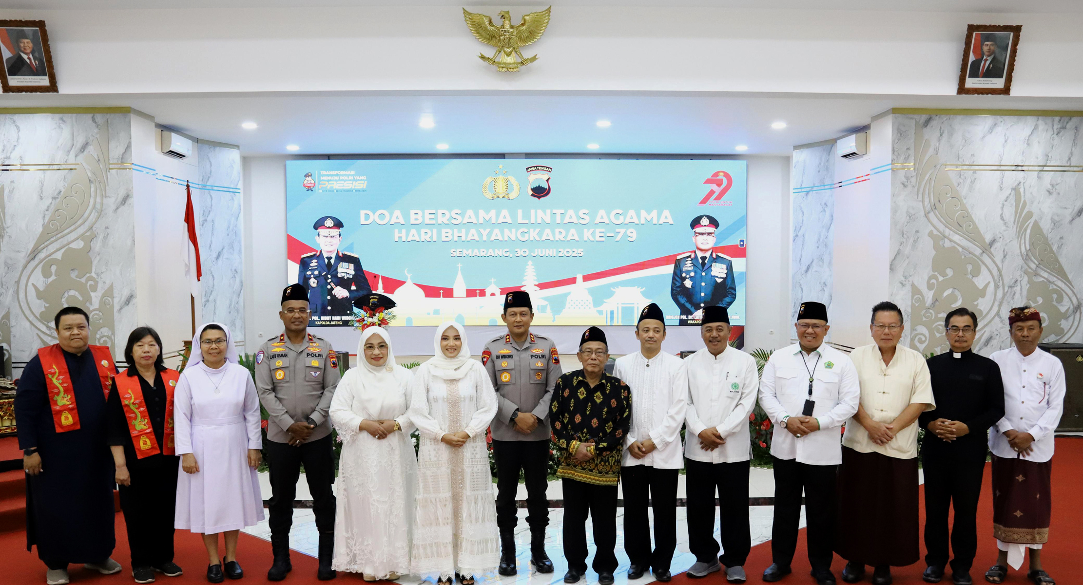 KOTA SEMARANG, BANKOM SEMARANG NEWS.ID – Dalam rangka memperingati Hari Bhayangkara ke-79, Polda Jawa Tengah menggelar kegiatan Doa Bersama Lintas Agama yang berlangsung khidmat dan penuh semangat kebersamaan, Senin pagi (30/06/2025) di Gedung Borobudur Mapolda Jateng, Semarang.