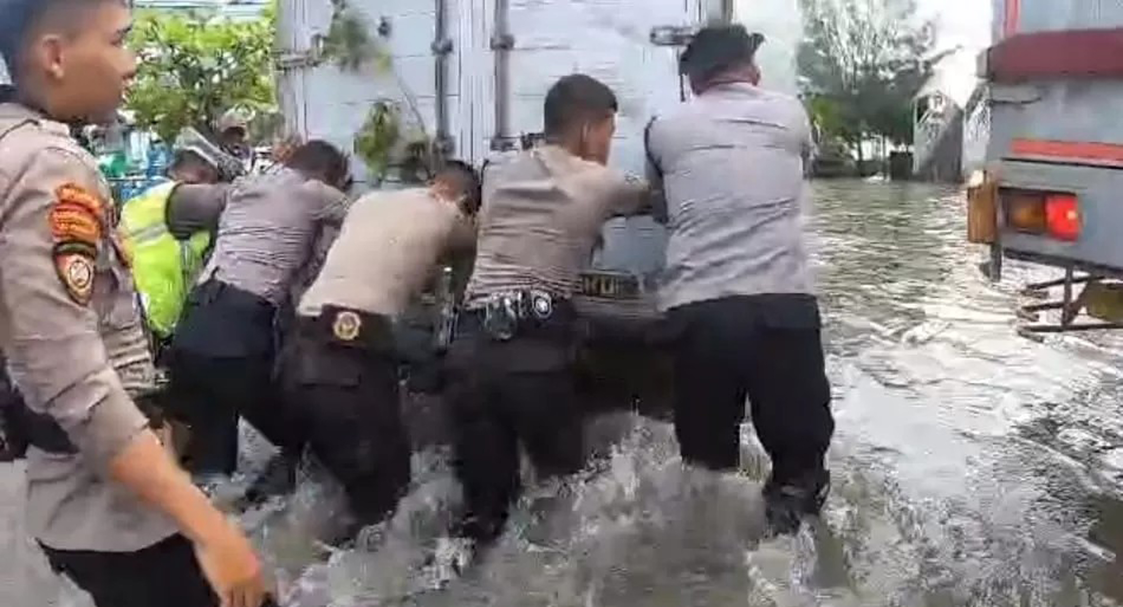 Polisi turun tangan membantu masyarakat yang terdampak genangan air yang belum surut sejak pagi hari. Upaya ini dilakukan untuk mengurai kemacetan yang terjadi akibat banjir, memastikan kelancaran arus lalu lintas, serta memberikan bantuan kepada kendaraan yang terjebak.