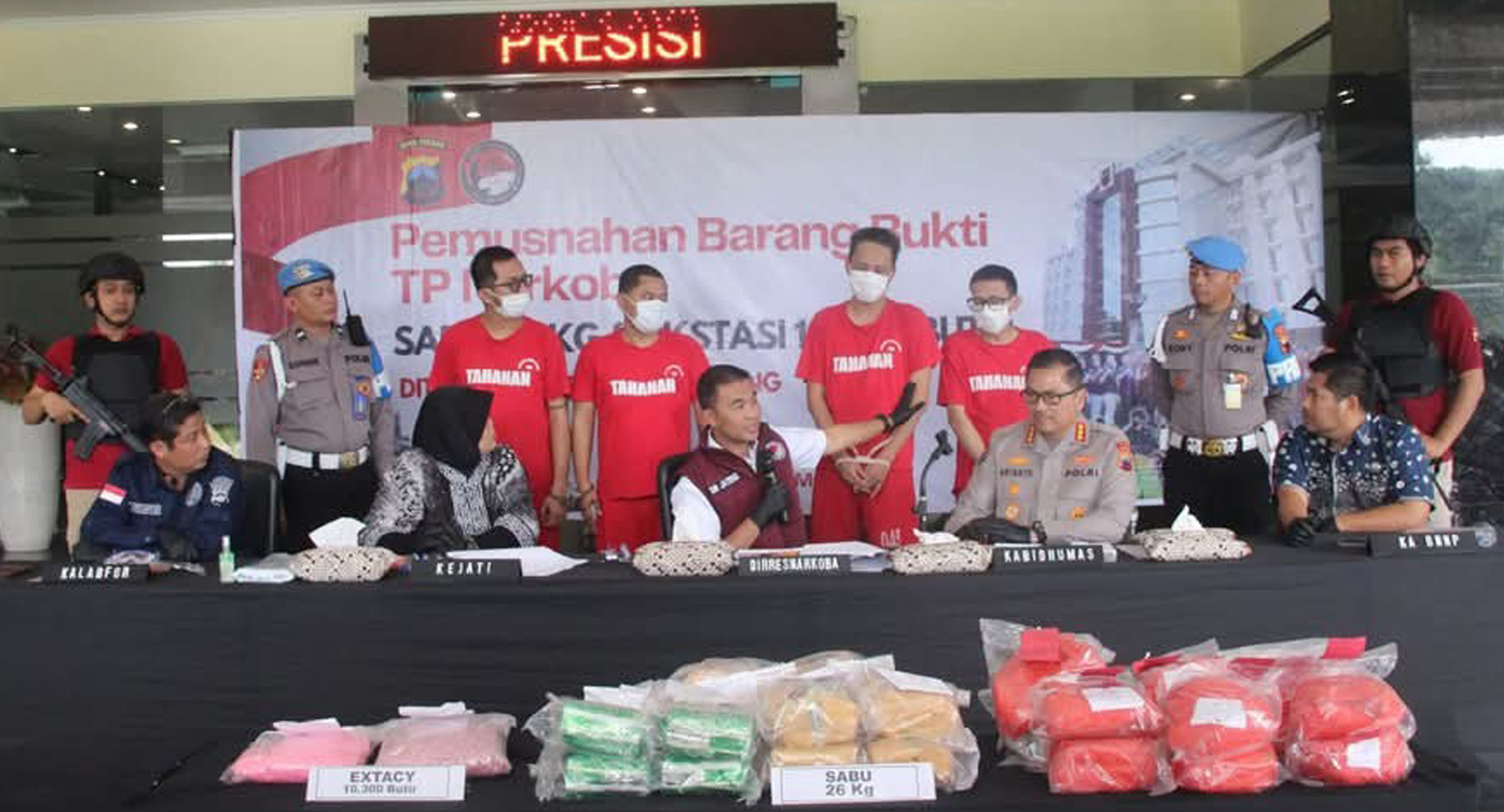 Dalam kegiatan itu, barang bukti yang dimusnahkan terdiri dari 26 kilogram sabu dan 10.300 butir pil ekstasi dengan total nilai mencapai Rp 31,15 miliar. Barang bukti tersebut merupakan hasil pengungkapan dua kasus narkotika sepanjang Januari hingga Februari 2025, yang turut mengamankan empat tersangka berinisial RT, MIA, SN, dan HS.