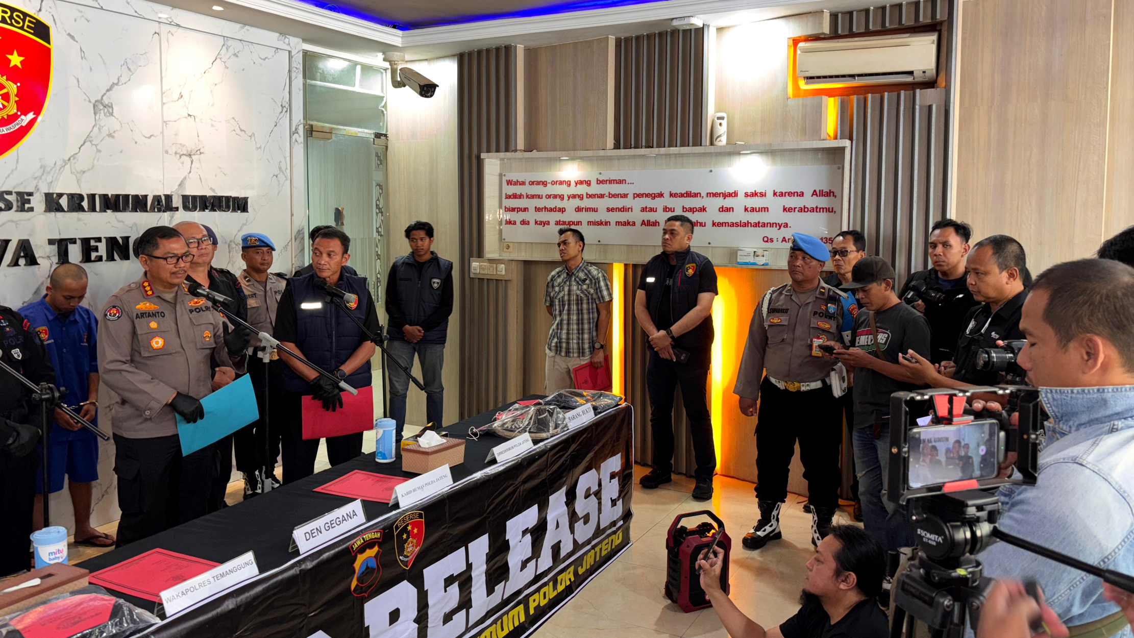 Konferensi pers ungkap kasus ini digelar di Mapolda Jateng pada Kamis (25/09/2025) siang. Hadir dalam kesempatan tersebut Dirreskrimum Polda Jateng Kombes Pol Dwi Subagio, Kabid Humas Kombes Pol Artanto, Kaden Gegana Satbrimob Polda Jateng Kompol Jon Peri, serta Wakapolres Temanggung Kompol Ana Setiyarti.