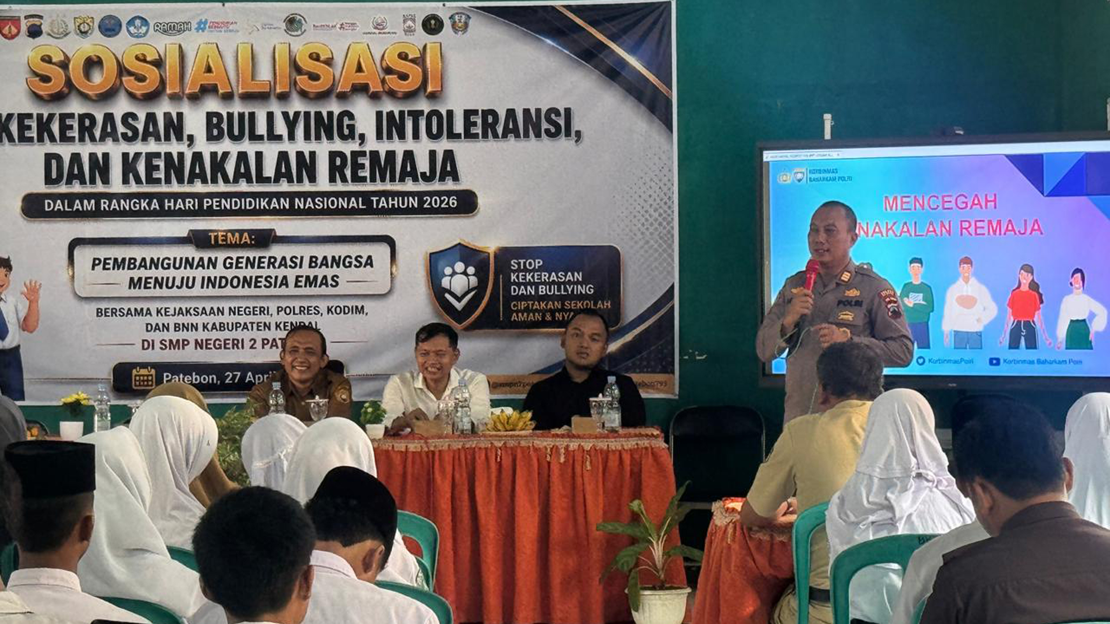 KAB.KENDAL, Bankomsemarangnews.id – Upaya membangun generasi muda yang berkarakter dan berintegritas terus digencarkan. Satuan Pembinaan Masyarakat (Sat Binmas) Polres Kendal menggelar sosialisasi anti kekerasan, perundungan (bullying), intoleransi, serta kenakalan remaja di SMPN 2 Patebon, Kabupaten Kendal, Senin (27/04/2026) pukul 09.30 WIB.