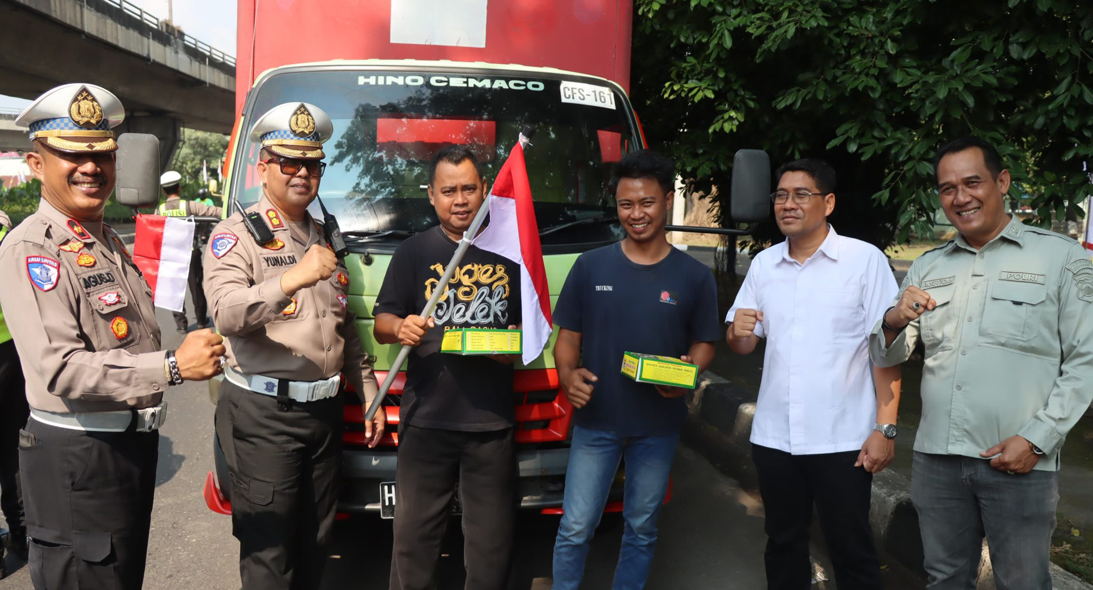 Sebanyak 200 bendera Merah Putih dibagikan dan dipasangkan secara langsung pada kendaraan truk, tronton, mobil boks, angkutan umum, hingga sepeda yang melintas. Selain itu, sebagai bentuk kepedulian, 200 kotak nasi turut dibagikan kepada para pengemudi dan pengguna jalan yang ikut berpartisipasi.