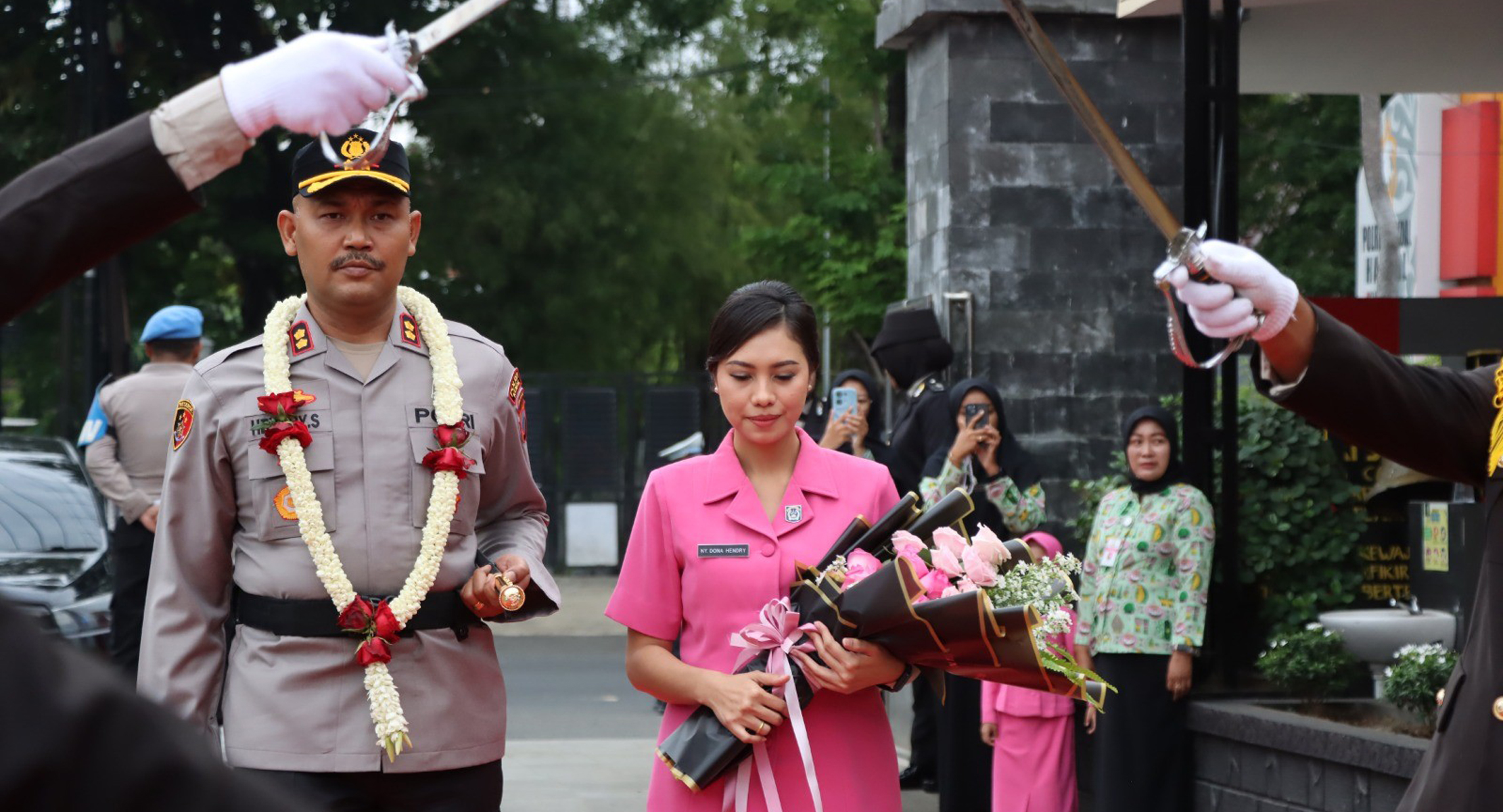 AKBP Hendry Susanto Sianipar dan istri saat mengikuti prosesi pedang pora di halaman Mapolres Kendal, Kamis (17/04/2025)