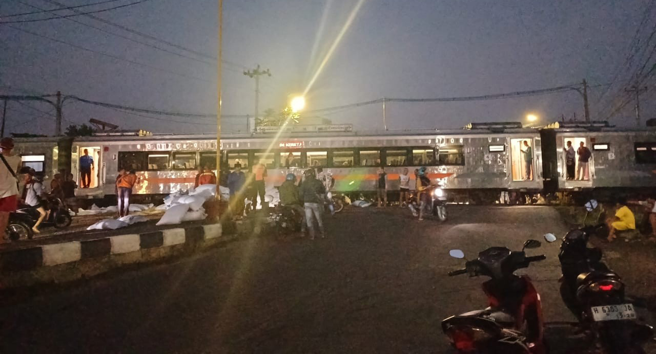 Insiden tersebut terjadi pada pukul 04.43 WIB dan sempat mengganggu perjalanan kereta api serta lalu lintas kendaraan di jalur nasional tersebut.